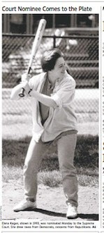 Esta foto publicada en la portada del Wall Street Journal ha causado un revuelo en los círculos políticos de Washington. Se trata de una foto tomada hace 17 años a Elena Kagan, jugando softball, lo cual no tiene nada de malo. Solo que el periódico la publica para referirse a la orientación sexual de Kagan, reflejando un prejuicio sobre cómo ella actuaría como Juez de la Suprema Corte de Estados Unidos. Todo un absurdo en el Siglo 21. Luego de cumplir con el proceso de confirmación, durante los próximos meses, Kagan será confirmada como Juez del más alto tribunal de Estados Unidos. De eso no tengo dudas.
