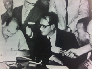 La primera foto es muy poco conocida. Se observa a mi padre, Salvador Jorge Blanco, saliendo de una de las reuniones de la Comisión Negociadora del Acta Institucional que puso fin a la revolución de abril de 1965. A la izquierda, con canas y espejuelos, Ellsworth Bunker, Embajador de Estados Unidos ante la OEA, quién representó a la organización hemisférica en esas negociaciones. Mi padre fue uno de los negociadores por parte del gobierno constitucionalista. Fueron jornadas agotadoras e históricas.