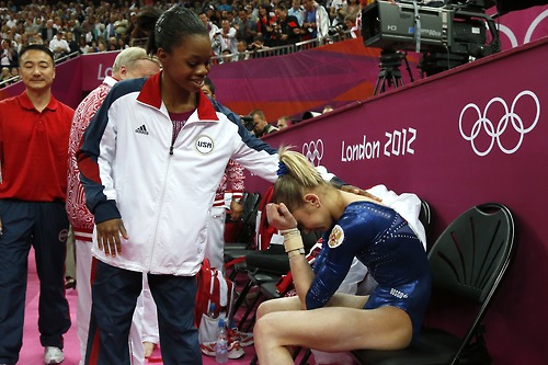 US gymnast Gabrielle Douglas (L) conforts a crying second-placed Russia’s gymnast Victoria Komova after she won the artistic gymnastics women’s individual all-around final at the 02 North Greenwich Arena in London on August 2, 2012 during the London 2012 Olympic Games. AFP PHOTO / THOMAS COEXTHOMAS COEX/AFP/GettyImages