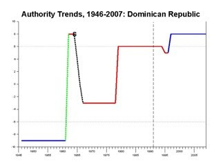Investigando sobre la democracia, he leído este interesante estudio titulado Polity IV Project: Political Regime Characteristics and Transitions (1800-2008), muy poco conocido en nuestro país, y me he encontrado con la gráfica que comparto con ustedes que corresponde a la tendencia de autoridad democrática en la República Dominicana. En él, podemos apreciar como en nuestros períodos de inestabilidad política, como en la dictadura hasta 1960, en el período siguiente al golpe de Estado de 1963 y a la revolución de abril de 1965, y la mano dura del régimen en la década de 1970, representan los «bajones» que hemos tenido en nuestra democracia. Luego, vienen «las subidas» en los ochenta hasta 1994, en donde «bajamos» como consecuencia del fraude electoral, y ya desde 1996, hemos tenido una línea estable hasta nuestros días.